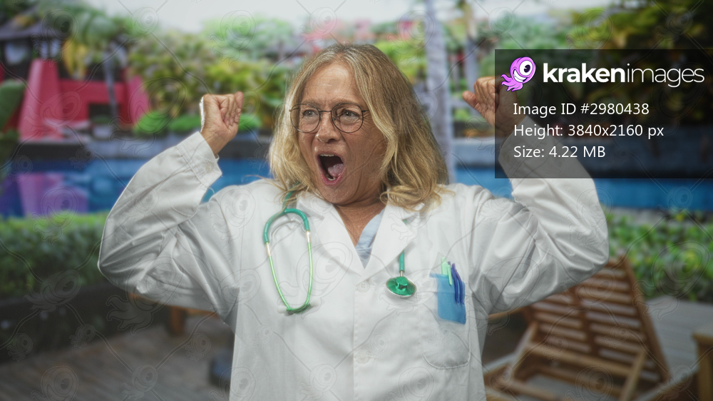 Senior woman doctor raises her arms cheering with stethoscope and pens in labcoat against a poolside backdrop in a studio setting; celebration.