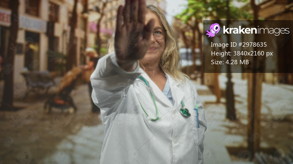 Senior woman doctor raising hand palm out to stop, stethoscope on neck, white medical coat visible, clear palm forward in sunlit narrow pedestrian street; protective safety. - Kraken Images