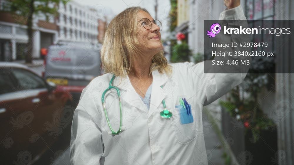 Senior woman doctor smiling raises arm with stethoscope and pens in lab coat on a busy city street with parked cars and planters; pride resilience.