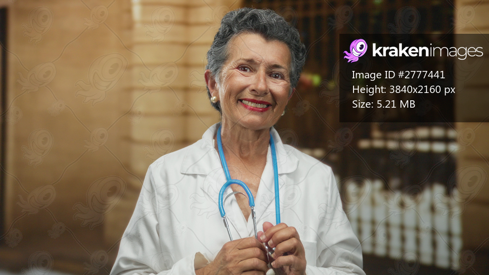 Senior woman doctor standing outdoors in an old town street holding a stethoscope while wearing a coat and displaying a warm smile.
