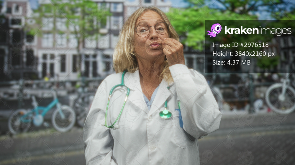 Senior woman doctor with stethoscope blows a kiss with hand to mouth on street wearing labcoat and glasses; compassion caregiving.