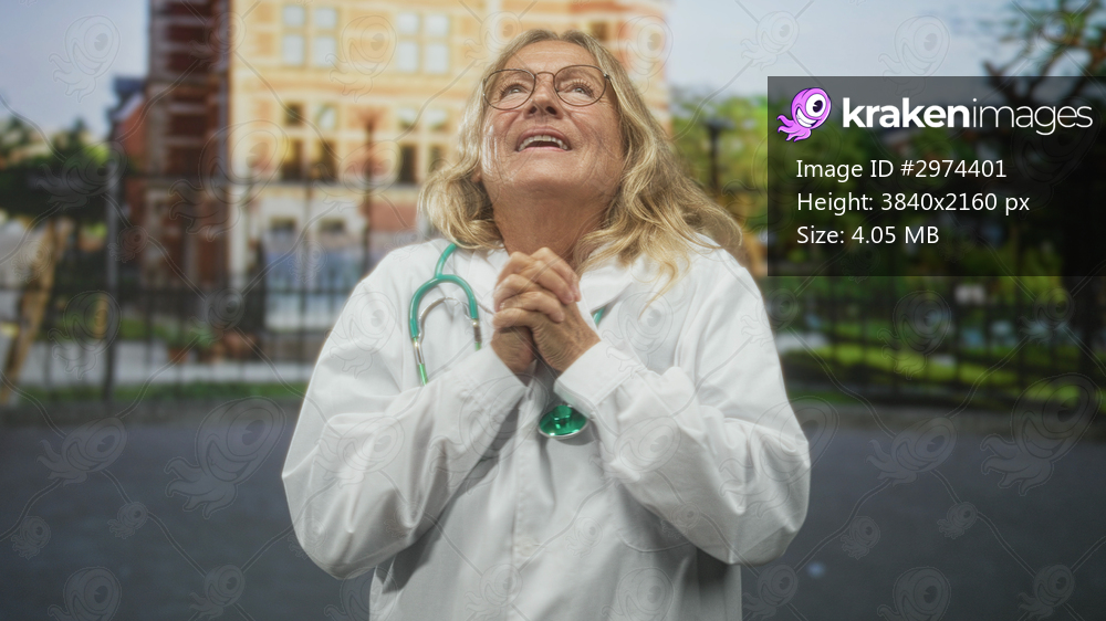 Senior woman doctor with stethoscope clasping hands to chest in front of a hospital building, smiling gently and radiating care; gratitude healing.