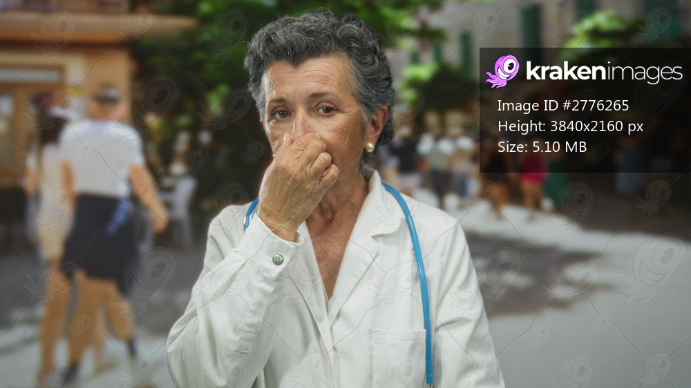 Senior woman doctor with stethoscope in old town street looking concerned outdoors in urban setting, implying medical awareness and environmental health. - Kraken Images