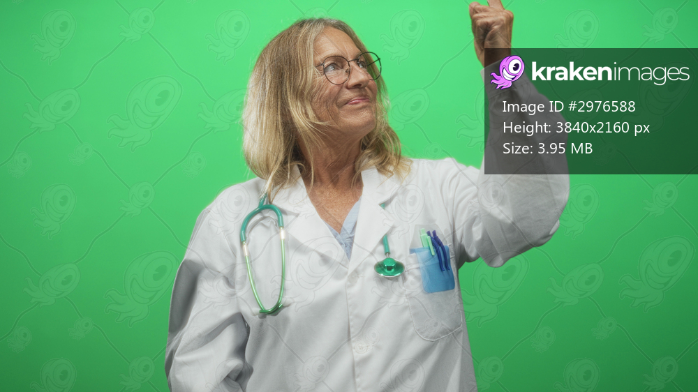 Senior woman doctor with stethoscope and pens in pocket points index finger upward toward green screen in studio; confidence guidance instruction.