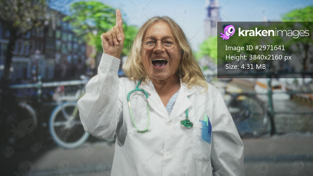 Senior woman doctor with stethoscope points finger up on street wearing white coat and glasses; health advice joy.