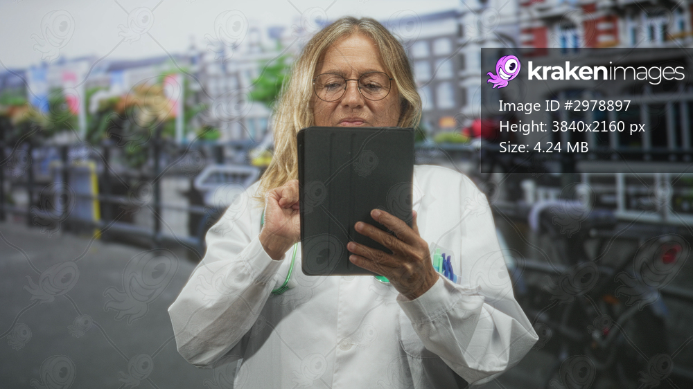 Senior woman doctor taps a tablet screen with hand visible while holding tablet on street, white coat and stethoscope visible; calm care.