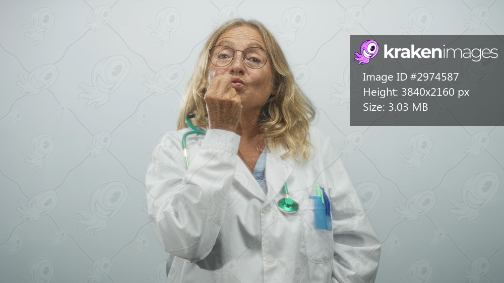 Senior woman doctor wearing white coat and stethoscope blows a kiss with her hand to camera in studio; compassion care warmth.