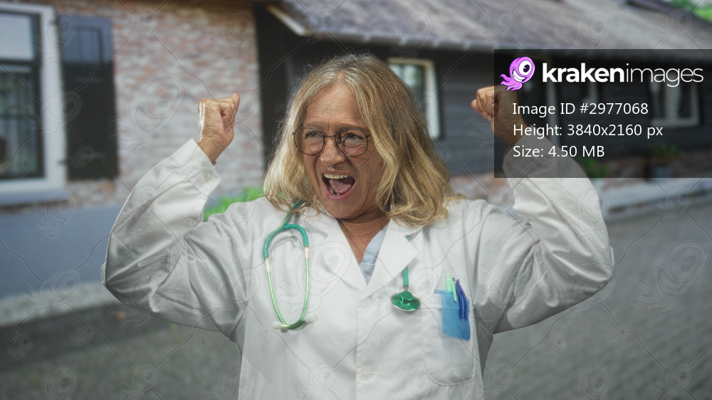 Senior woman doctor wearing white coat and stethoscope raises fists and smiles on a street outside a building; joy resilience triumph.