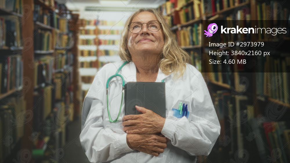 Senior woman doctor wearing white coat and stethoscope smiles and holds tablet to chest with hands clasped in a building library aisle; wisdom compassion. - Kraken Images
