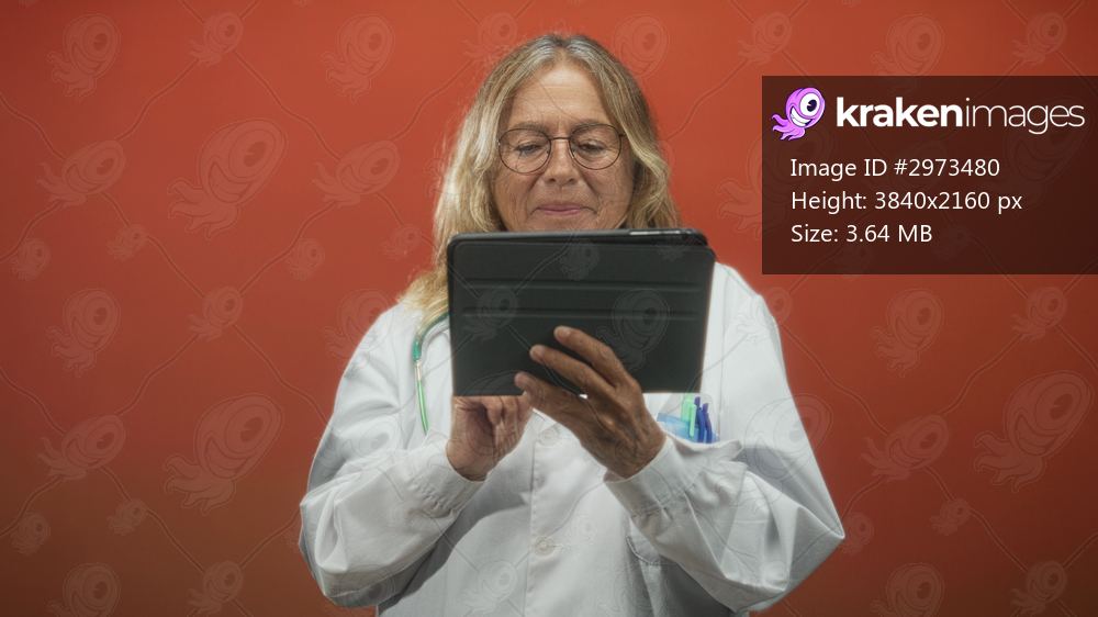 Senior woman doctor wearing white coat and stethoscope tapping tablet screen with finger in studio; telemedicine confidence care.
