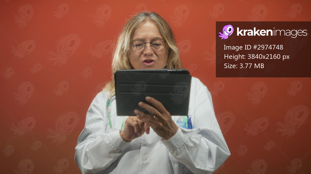 Senior woman doctor wearing white coat and stethoscope tapping tablet screen with finger in studio; telemedicine confidence care.