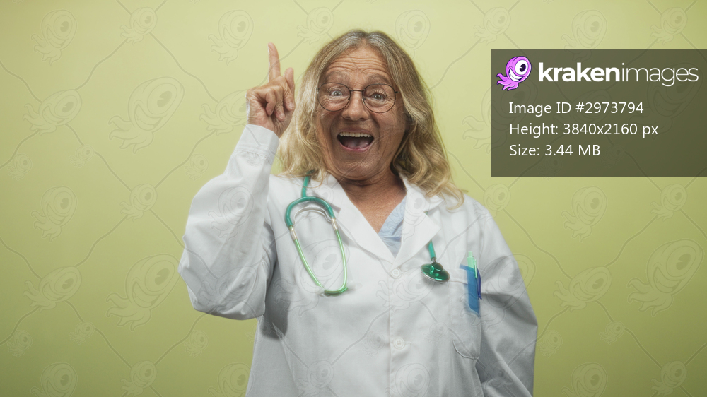 Senior woman doctor wearing white lab coat and glasses with stethoscope points finger upward and smiles in studio; joyful confidence.