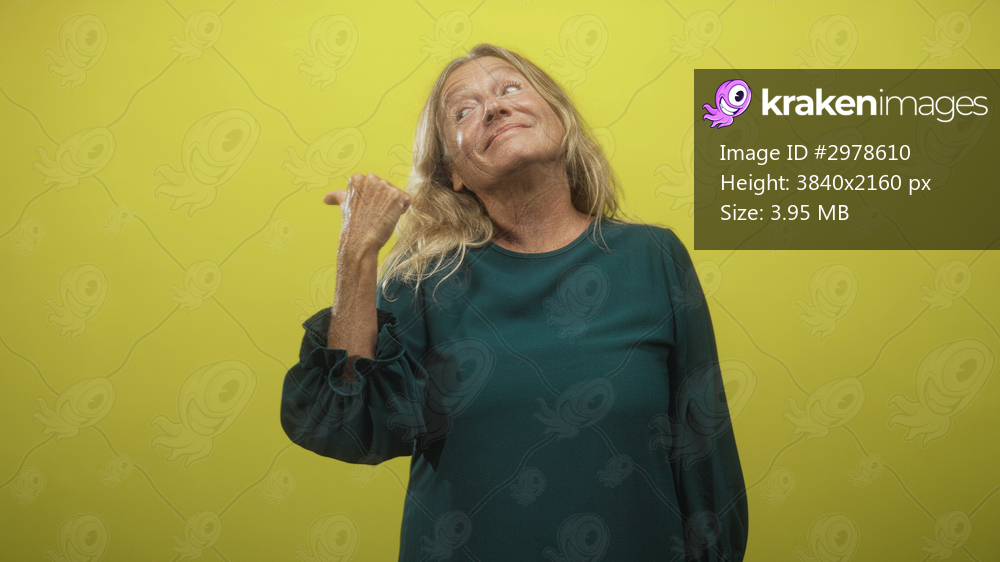 Senior woman with exposed hand gesturing thumb over shoulder pointing to self in a studio with bright yellow backdrop; quiet pride.