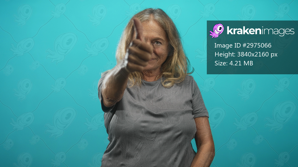 Senior woman extends arm and alternates thumb up and thumb down gestures facing camera with grey t shirt against turquoise backdrop in studio; judgment change. - Kraken Images