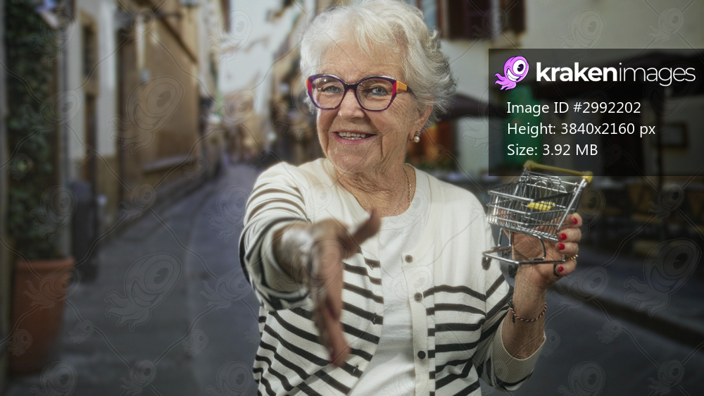 Senior woman extends hand for handshake while holding a miniature shopping cart on a narrow street cafe; warmth hospitality.