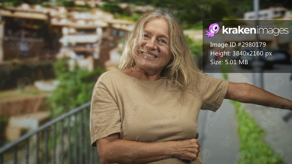 Senior woman extends her arm and holds her side while smiling on a residential street by railings and parked cars, hair windblown and candid; joyful freedom. - Kraken Images