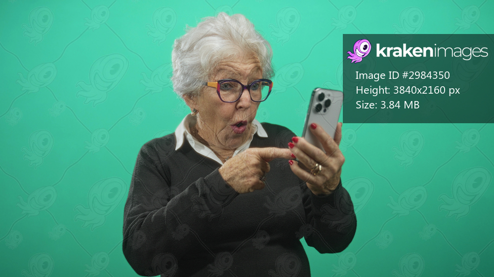 Senior woman with eyeglasses holding smartphone, pointing at screen and giving thumbs up in studio; joy curiosity.