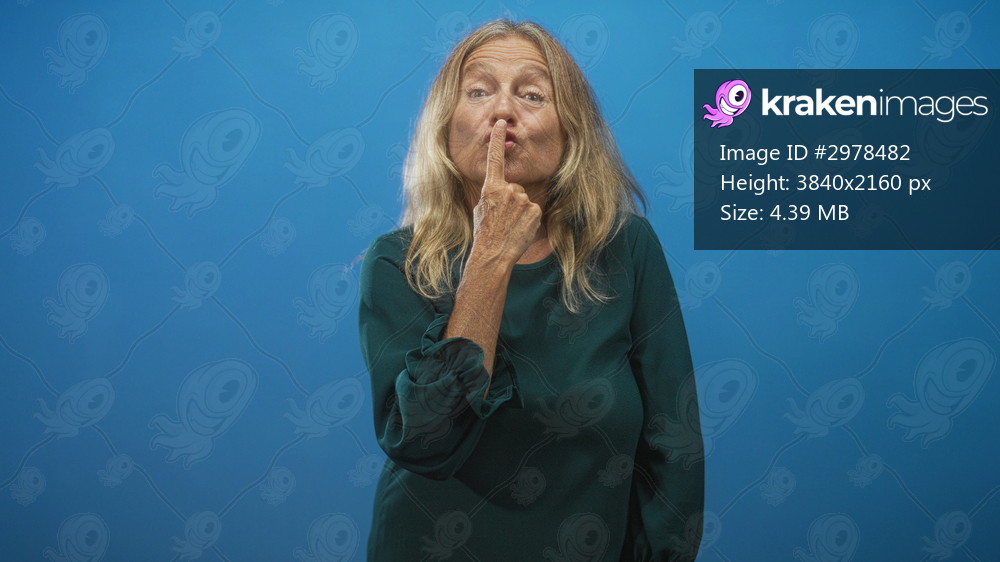 Senior woman with finger to lips shushing in studio, wearing green blouse while smiling and winking; playful secrecy.