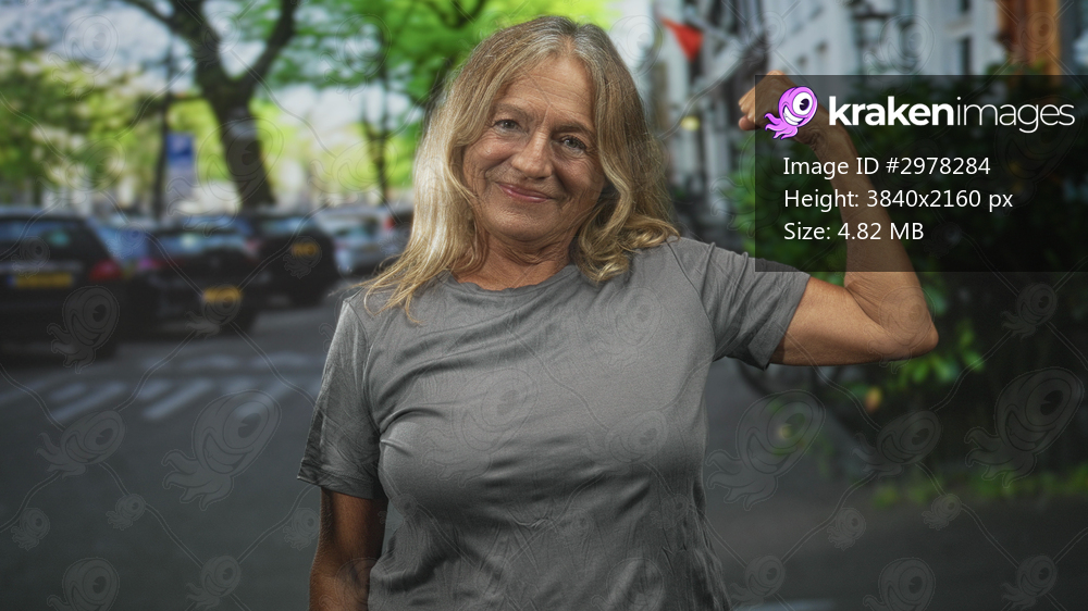 Senior woman flexes her arm and smiles while wearing a gray tshirt on a busy city street lined with cars and trees; confidence empowerment.