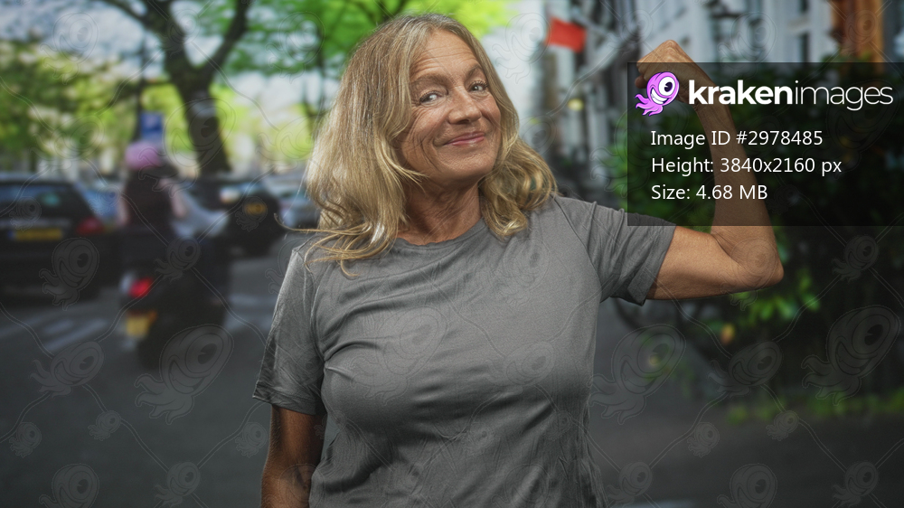 Senior woman flexes her arm and smiles while wearing a gray tshirt on a busy city street lined with cars and trees; confidence empowerment.
