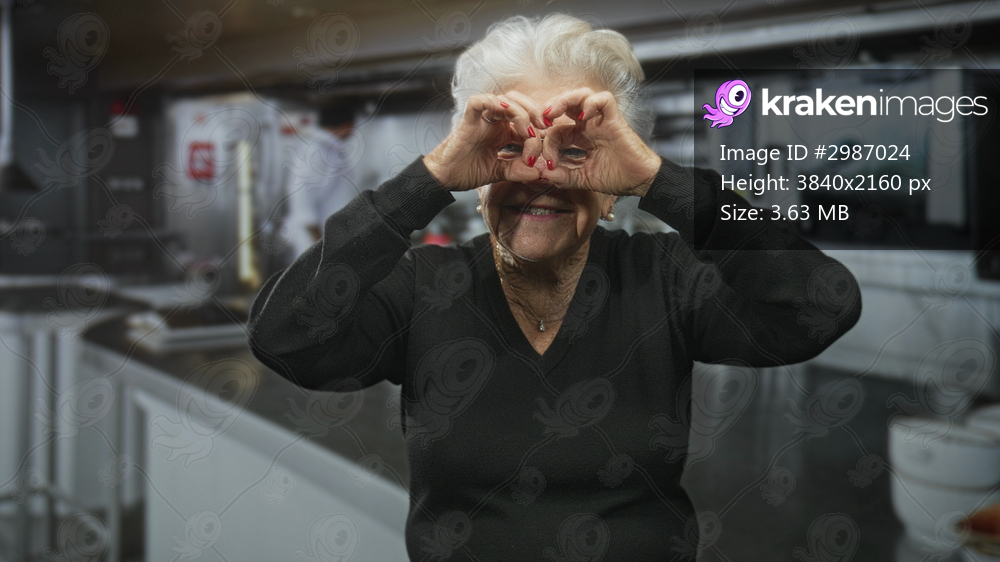 Senior woman forms heart shape with hands and smiles at a kitchen counter in building; playful affection.