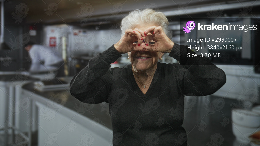 Senior woman forms heart shape with hands and smiles at a kitchen counter in building; playful affection.