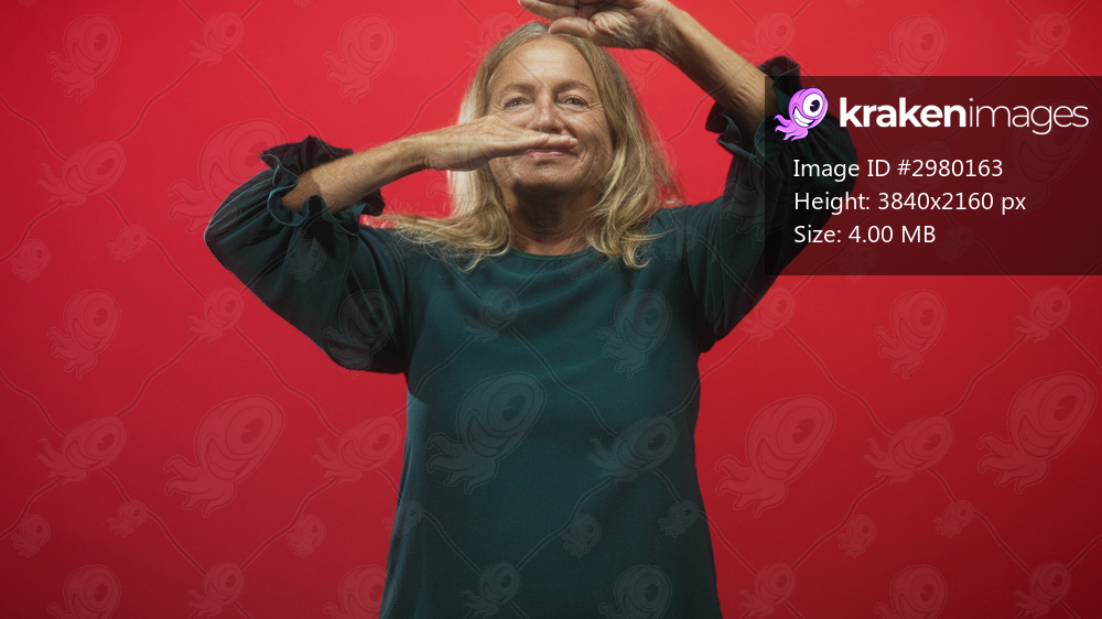 Senior woman framing her face with fingers and raised hand gesture in a studio red backdrop wearing a green dress; playful moment.