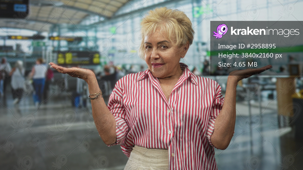 Senior woman gestures palms up with open hands at airport terminal wearing striped shirt; curiosity indecision planning.