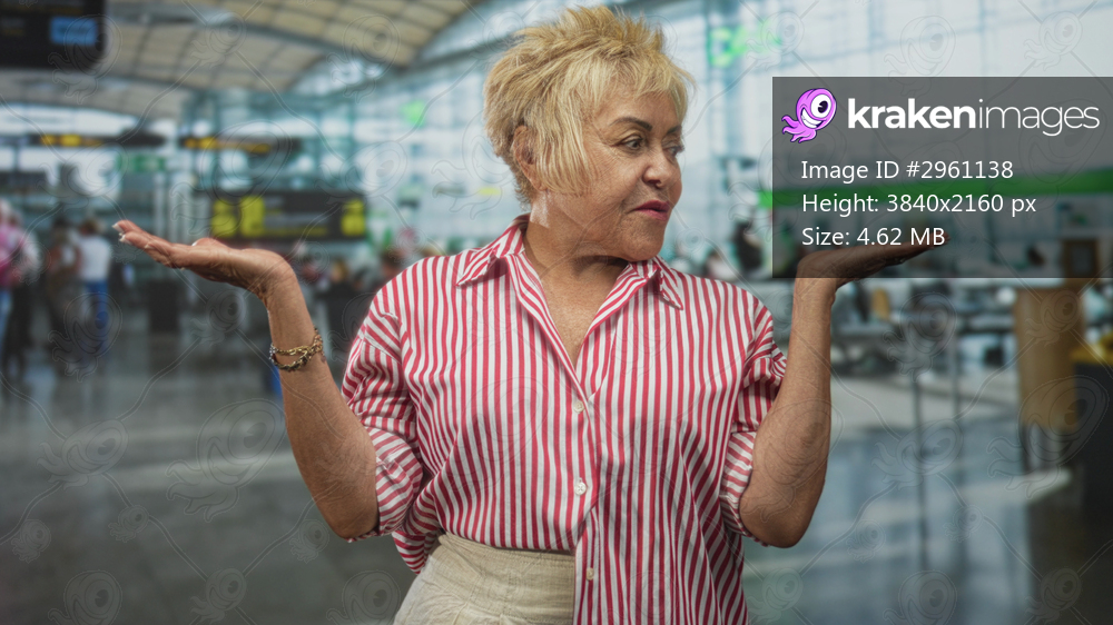 Senior woman gestures palms up with open hands at airport terminal wearing striped shirt; curiosity indecision planning.