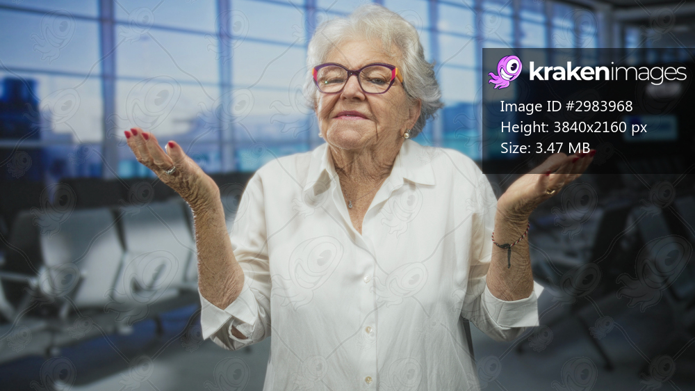Senior woman gives thumbs up with hands at airport terminal wearing glasses and white blouse; optimism.