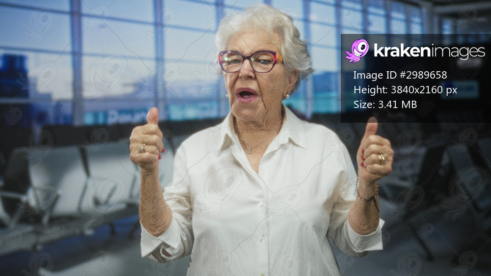 Senior woman gives thumbs up with hands at airport terminal wearing glasses and white blouse; optimism.