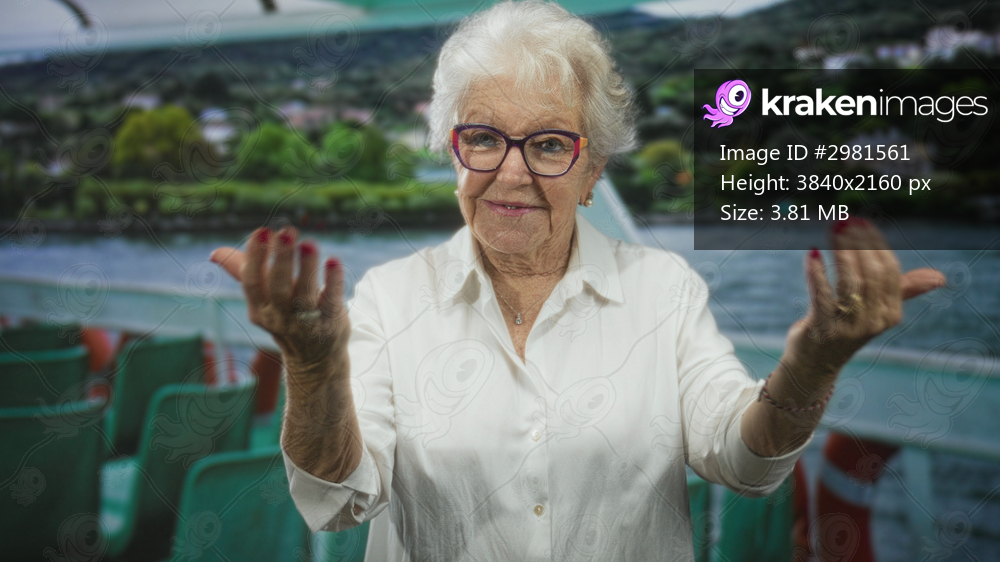 Senior woman giving thumbs up and beckoning with both hands on a passenger ferry deck studio set with waterfront view; approval warmth.