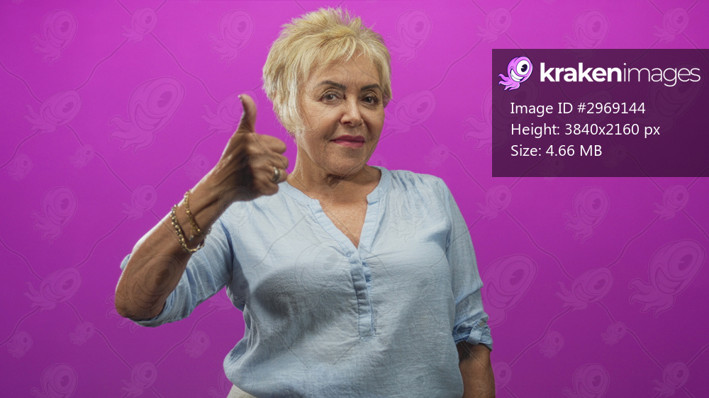 Senior woman giving thumbs up with right hand and bracelets in studio magenta backdrop; confidence encouragement.
