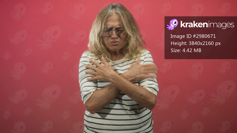 Senior woman with glasses crossing arms over chest while clutching sternum in studio with pink backdrop; pain concern.