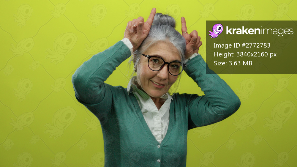 Senior woman with glasses in green cardigan having fun gesturing with fingers as horns against vibrant yellow background suggests playful personality.