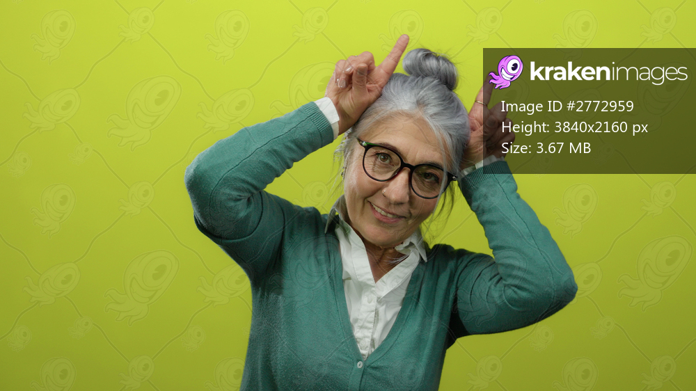 Senior woman with glasses in green cardigan having fun gesturing with fingers as horns against vibrant yellow background suggests playful personality.