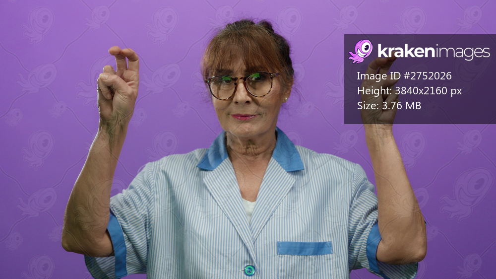 Senior woman with glasses in uniform makes hand gestures against a vibrant purple background, conveying positivity and professionalism in a cleaning occupation. - Kraken Images