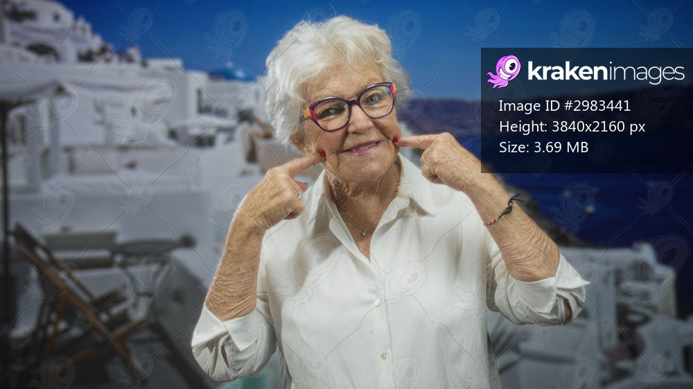 Senior woman with glasses points finger to cheeks and smiles in studio with white buildings and sea; playful joy.