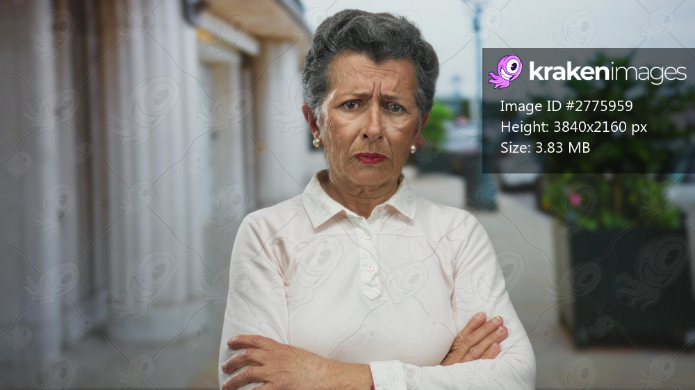 Senior woman with grey hair and arms crossed stands on an urban street outdoors, expressing a serious emotion amid a cityscape backdrop of columns and greenery. - Kraken Images