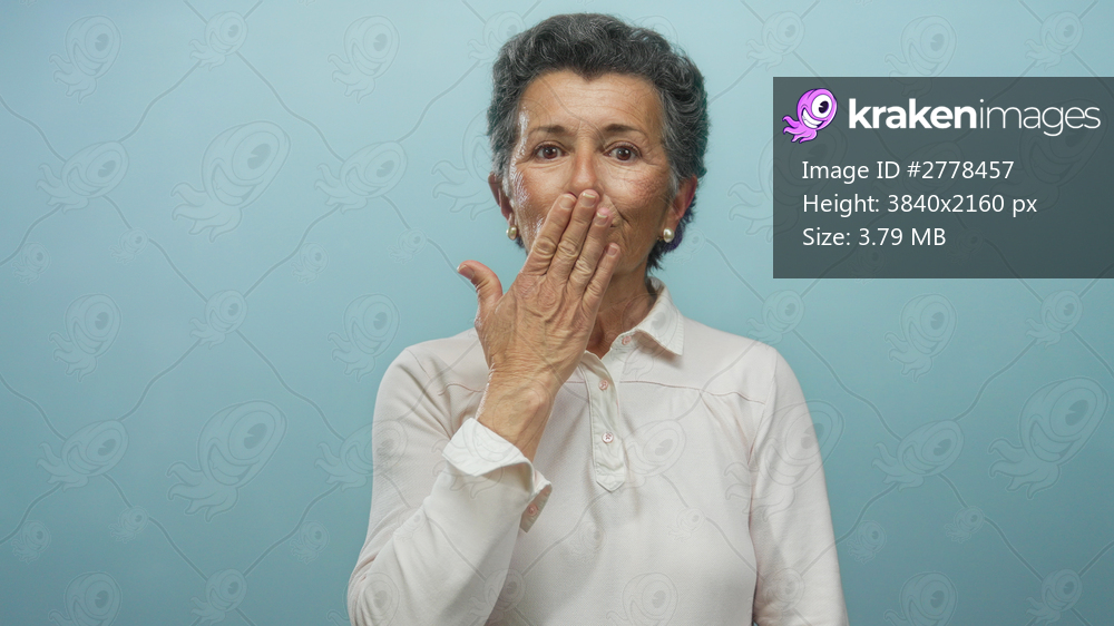 Senior woman with grey hair blows a kiss against a blue background showing warmth and affection