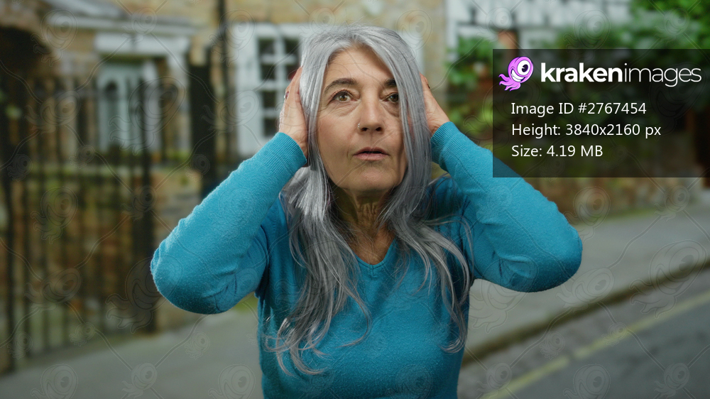 Senior woman with grey hair and blue sweater covers her ears on an outdoor street, with a brick wall background creating a dramatic urban scene.