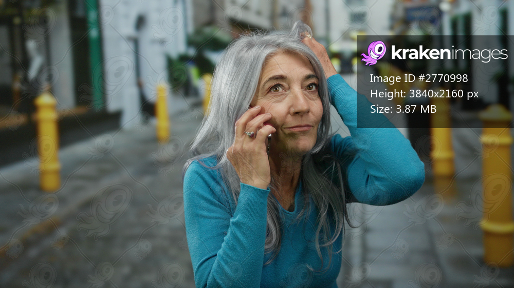 Senior woman with grey hair chatting on a phone in a vibrant urban street with yellow bollards and a backdrop of city architecture.