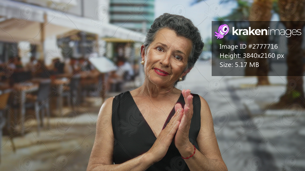 Senior woman with grey hair clapping hands on a lively city street with outdoor cafes and palm trees in an urban town setting.