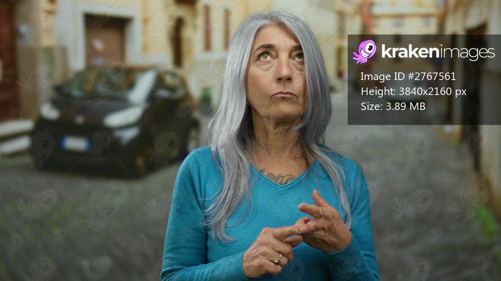 Senior woman with grey hair counting on her fingers while standing on an outdoor street with cobblestones and blurred buildings in the background.