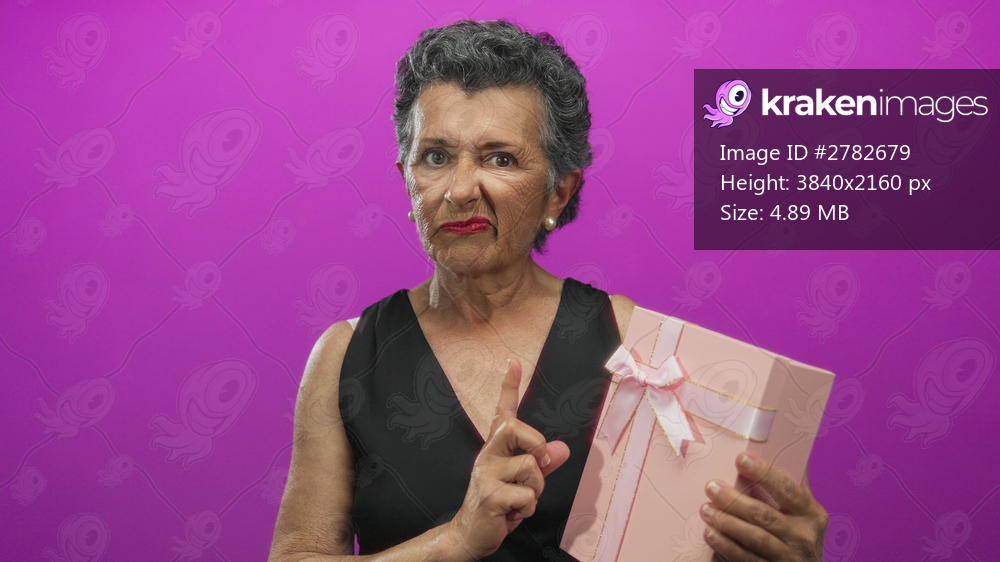 Senior woman with grey hair examines a pink gift box against a vibrant pink background, expressing curiosity and contemplation.