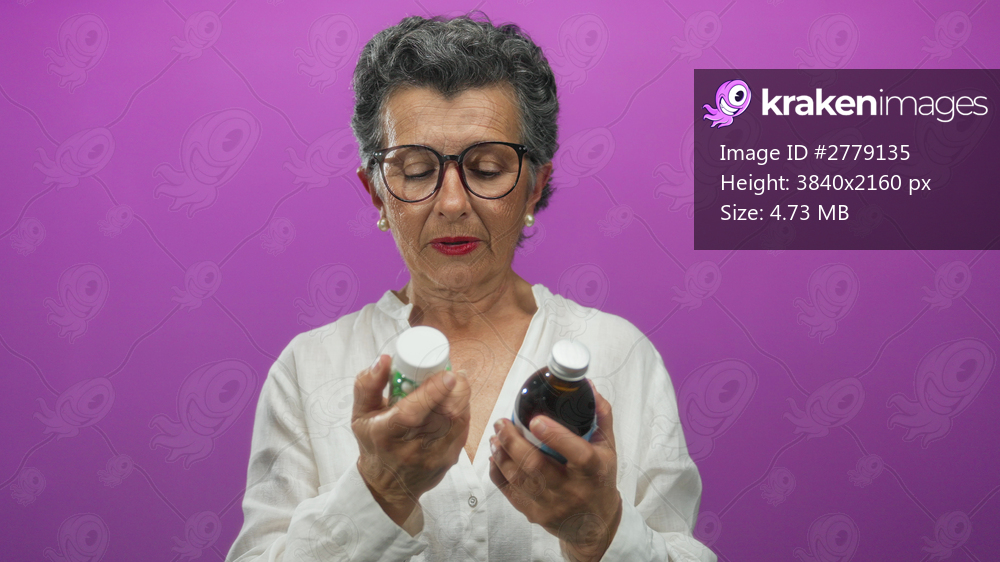 Senior woman with grey hair examines medicine bottles against a vibrant pink background, showcasing healthcare choices for mature adults.