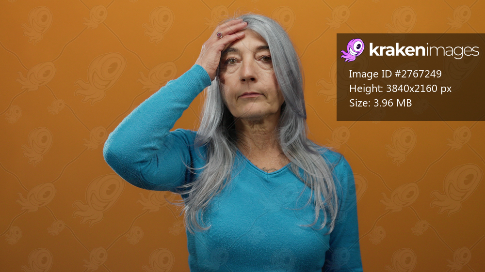 Senior woman with grey hair expresses surprise against isolated orange wall background wearing blue sweater.