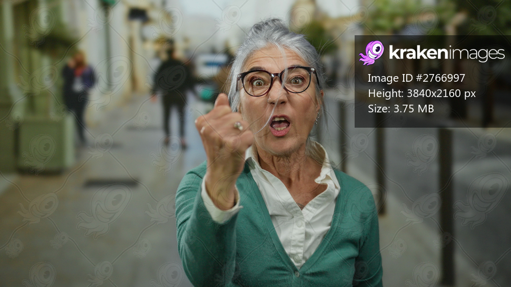 Senior woman with grey hair expressing anger on an urban street, wearing glasses and a green sweater, as blurred pedestrians pass by in the background. - Kraken Images