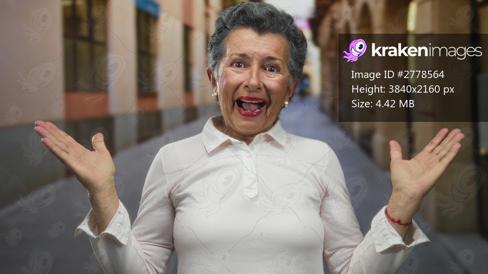Senior woman with grey hair expressing joy on a city street in an old town urban setting, raising her hands and smiling broadly on a lively outdoor day. - Kraken Images
