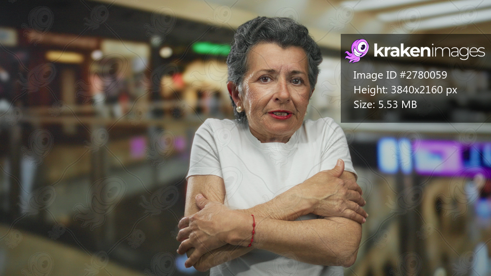Senior woman with grey hair feeling cold inside a mall, wearing a white shirt and expressing discomfort with arms crossed, surrounded by blurred indoor shopping setting. - Kraken Images
